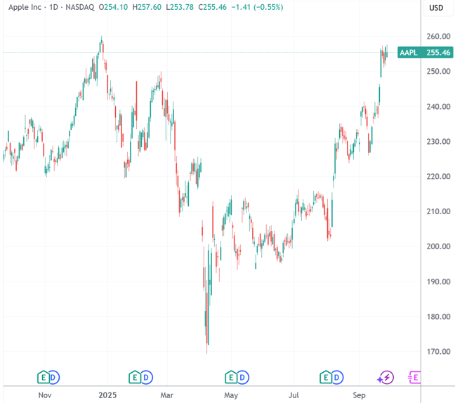 作为背景,在美股“AI交易”陷入疲倦的本周,苹果延续了9月发布会后的强势表现。消费电子巨头本月的累计涨幅超过10%,距离历史新高只差不到2%。