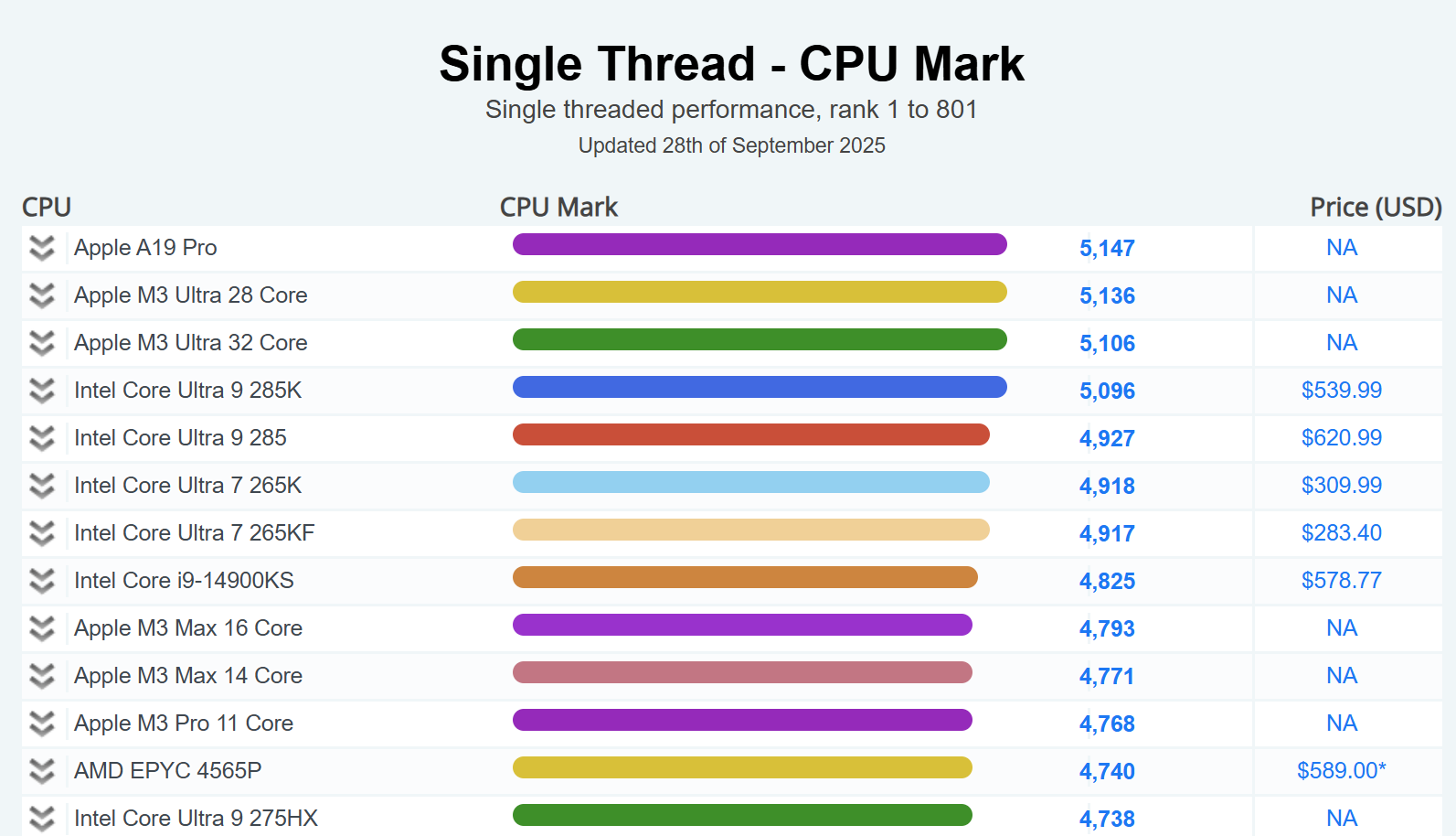 在PassMark本周更新的CPU单核性能排行榜上,A19 Pro力压自家的M3 Ultra,以及英特尔Ultra 9 285K、AMD的EPYC 4565P等桌面级处理器登顶。